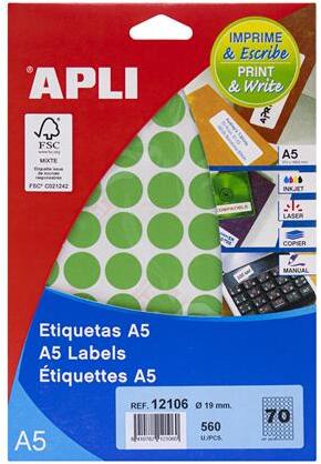 APLI Etikett, 19 mm kör, színes, A5 hordozón, APLI, zöld, 560 etikett/csomag (LCA12106) - irodaoutlet