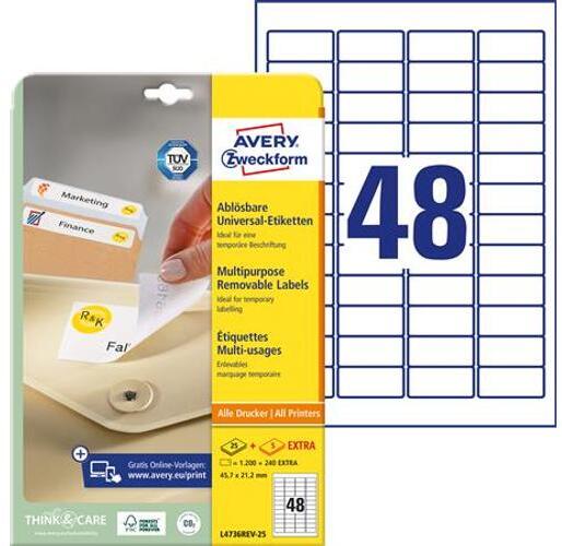Avery Zweckform Etikett, univerzális, eltávolítható, 45, 7x21, 2 mm, AVERY ZWECKFORM, 1440 etikett/csomag (AYL4736REV25) - jatekotthon