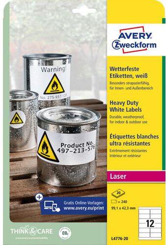 Nagy tapadóképességű fehér öntapadós címke nedves és poros környezetben történő használatra. A poliészterből készült címke kiválóan ellenáll zsírnak, szennyeződésnek, víznek, UV-sugárzásnak és a hőmérsékletingadozásnak (-20 és +80 °C között). Lézernyomtatóval tűélesen, elmosódásmentesen feliratozható. Téglalap alakú, lekerekített sarkokkal. Alkalmas hosszú távú jelölésre forgalmas területeken, ipari csarnokokban, raktárakban, továbbá kültéren is használható. Klímasemleges, környezetkímélő módon, PVC-mentesen gyártva. Anyagsűrűség: 75 g/m2.